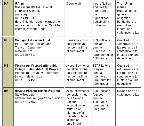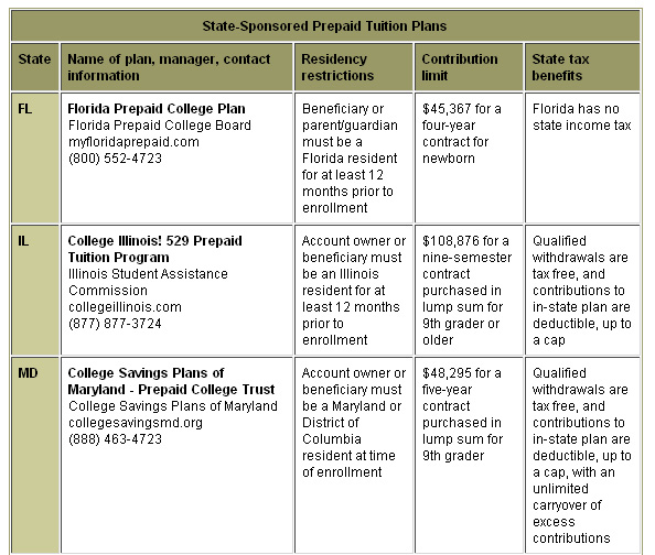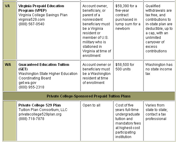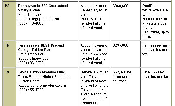 This table provides information on 529 prepaid tuition plans that are currently accepting new enrollments. The first section covers state-sponsored plans; the second covers college-sponsored plans.