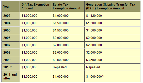 *Estate tax and generation-skipping transfer tax are scheduled to be repealed during 2010. Lifetime gifts, however, will continue to be subject to gift tax.
