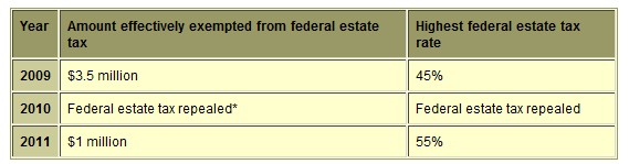 *The federal estate tax was repealed for 2010, and is reinstated in 2011. Congress may reinstate the estate tax retroactively to 2010. If it does, it may use 2009 levels or 2011 levels, or other levels altogether.